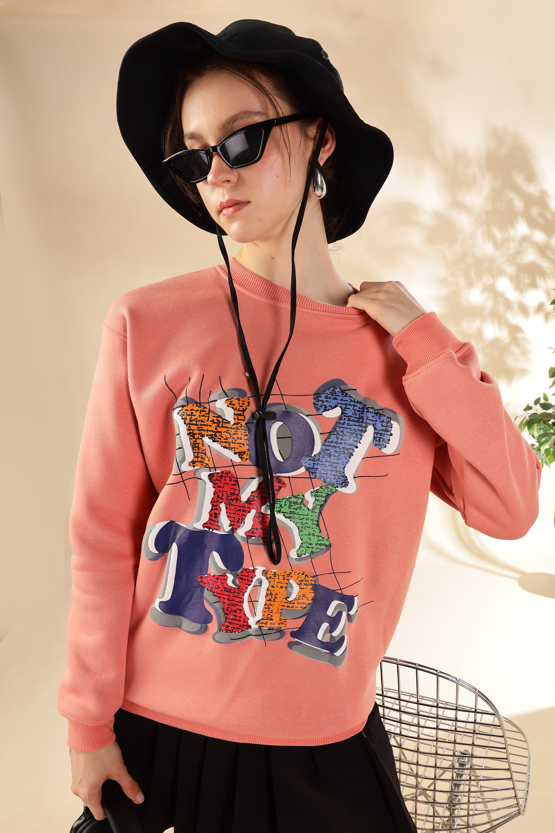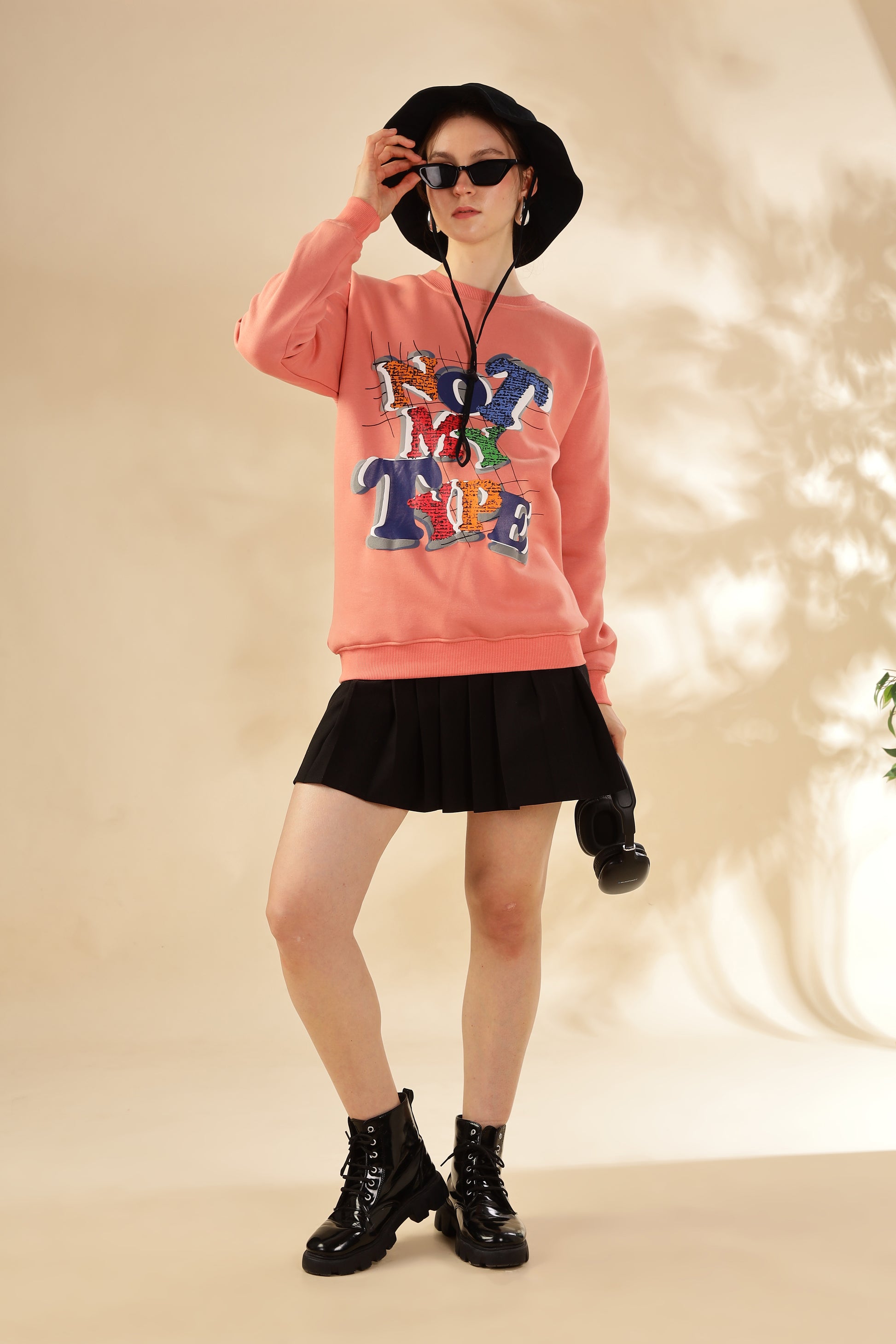 The standout feature? A playful and unapologetic “NOT MY TYPE” graphic across the front, rendered in chunky, 3D-style lettering filled with multicolor printed textures. Each letter pops in a unique color – orange, navy, red, green, and blue – making this sweatshirt as expressive as your personality.