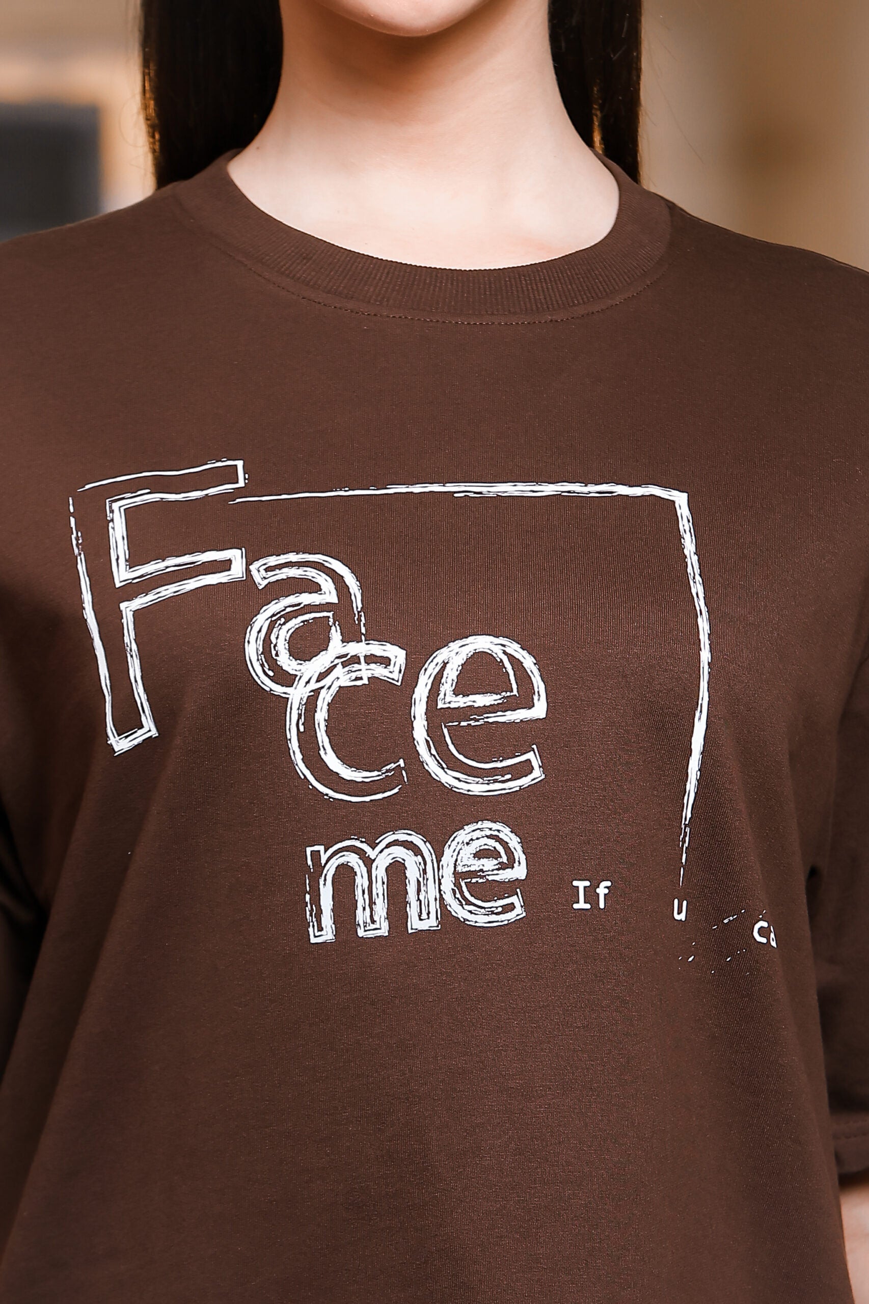 FACE ME Printed Premium Brown Round Neck Bio Wash 3/4 Sleeve Oversize Pure Cotton T-Shirt for Women MRP: ₹1499 Sale Price: ₹749 Stand out with confidence in our FACE ME Printed Premium Brown T-Shirt. Made from 220 GSM pure cotton, this round neck, bio-wash t-shirt offers superior comfort and durability. The brown color and striking FACE ME print add a distinctive touch to your casual wardrobe. Featuring 3/4 sleeves and an oversize fit, this t-shirt ensures a relaxed and contemporary look, perfect for any casual occasion or a laid-back day. This versatile piece is an essential addition to any modern woman's collection.