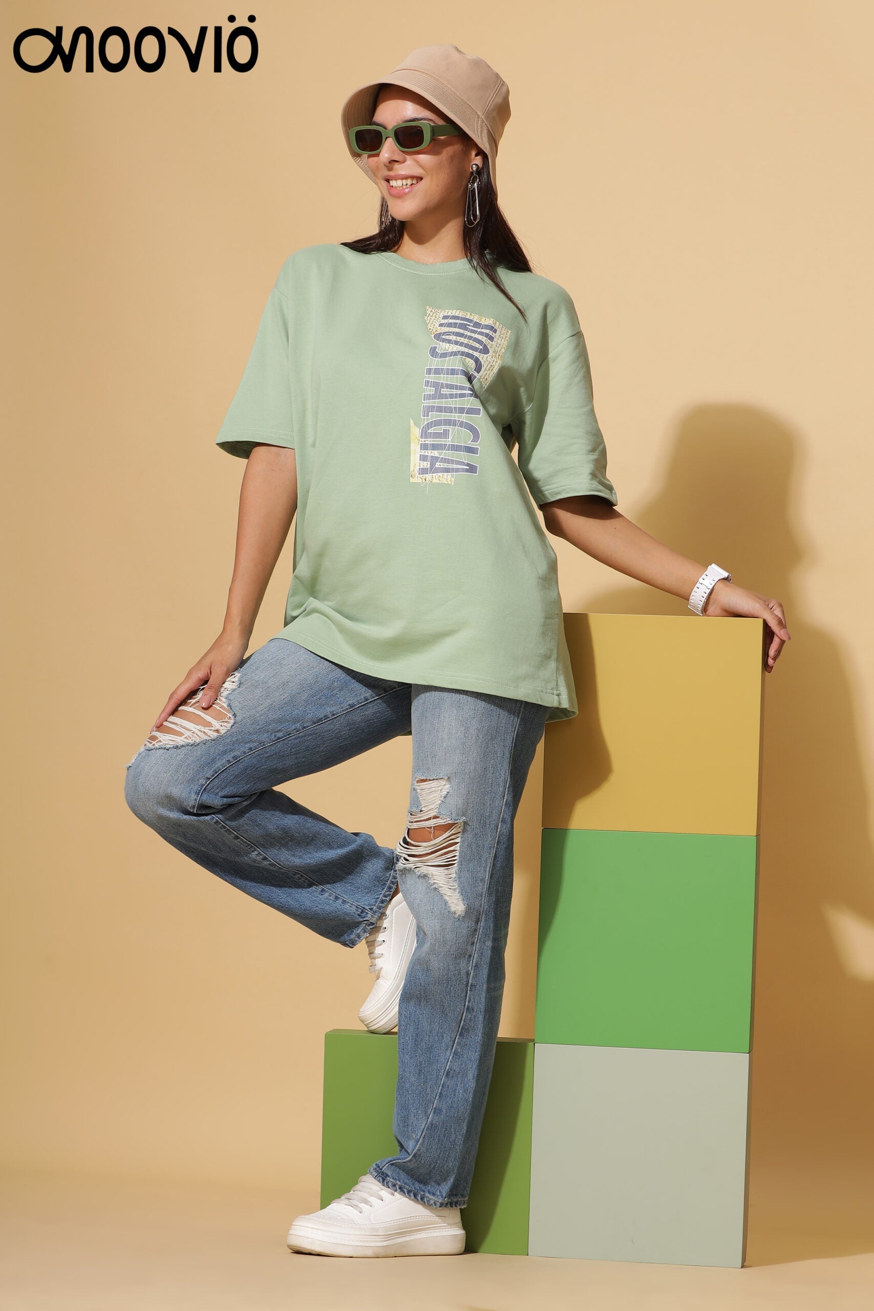 NOSTALGIA Printed Premium Sage Green Round Neck Bio Wash 3/4 Sleeve Oversize Pure Cotton T-Shirt for Women MRP: ₹1499 Sale Price: ₹749 Embrace the charm of the past with our NOSTALGIA Printed Premium Sage Green T-Shirt. Made from 220 GSM pure cotton, this round neck, bio-wash t-shirt offers exceptional comfort and durability. The soothing sage green color and nostalgic NOSTALGIA print add a unique touch to your casual wardrobe. Featuring 3/4 sleeves and an oversize fit, this t-shirt ensures a relaxed and contemporary look, perfect for any casual occasion or a laid-back day. This versatile piece is a must-have for any modern woman's collection.